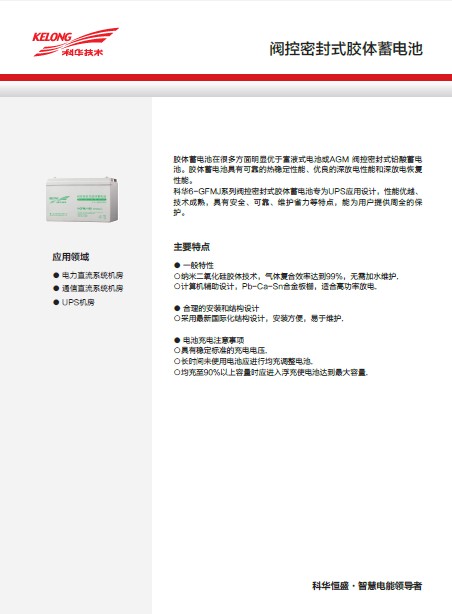 科华GFM系列控密封式铅酸蓄电池专为UPS应用设计,性能优越、技术成熟,具有安全、可靠、维护省力等特点,能为用户提供周全的保护。
