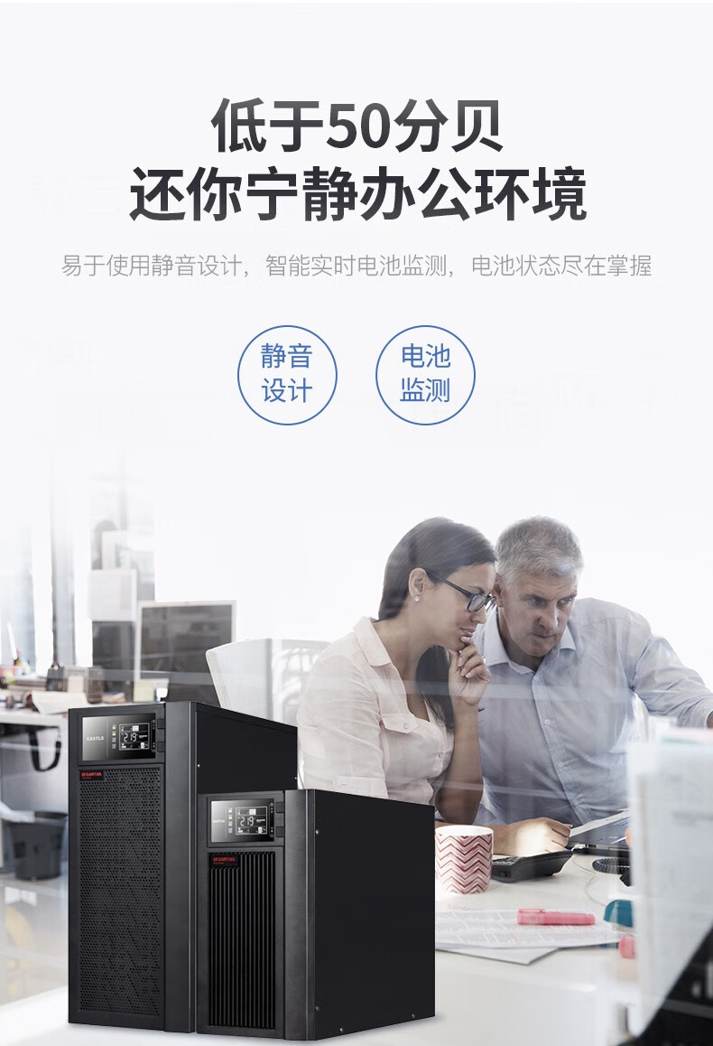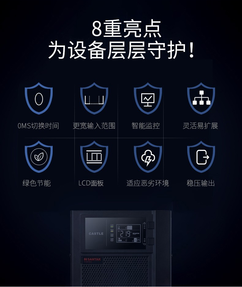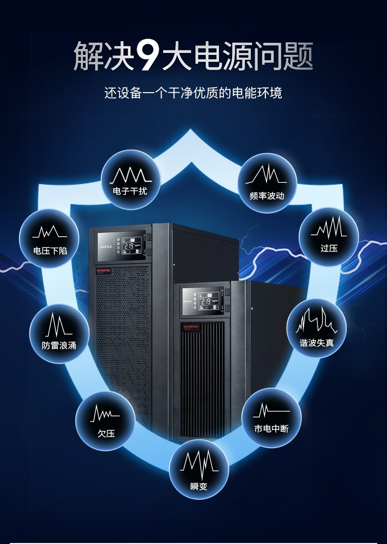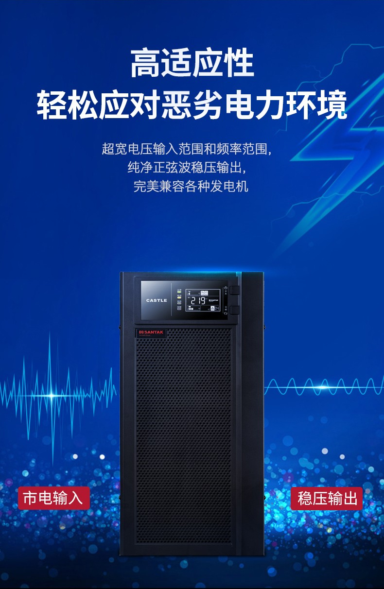 山特ups电源城堡系列是一款具有强壮习惯性、装备灵敏的商品。选用领先的dsp数字操控先进技能,有用的提高了商品功用和体系的牢靠性,并完成了更高功率密度的集成化和小型化。一起为了全方位的用户满意个性化需求,城堡系列供给了非常丰厚的可拓展功用,用户能够根据需求灵敏装备。