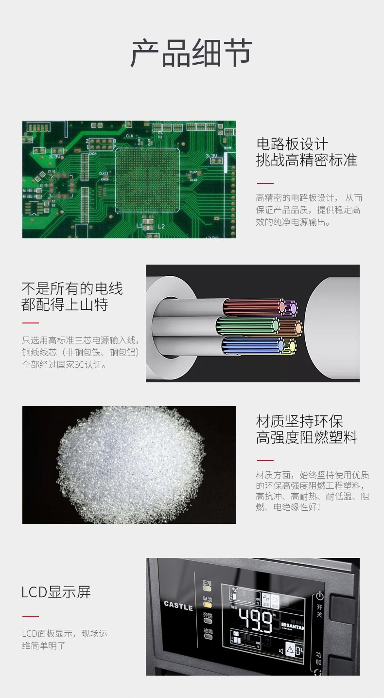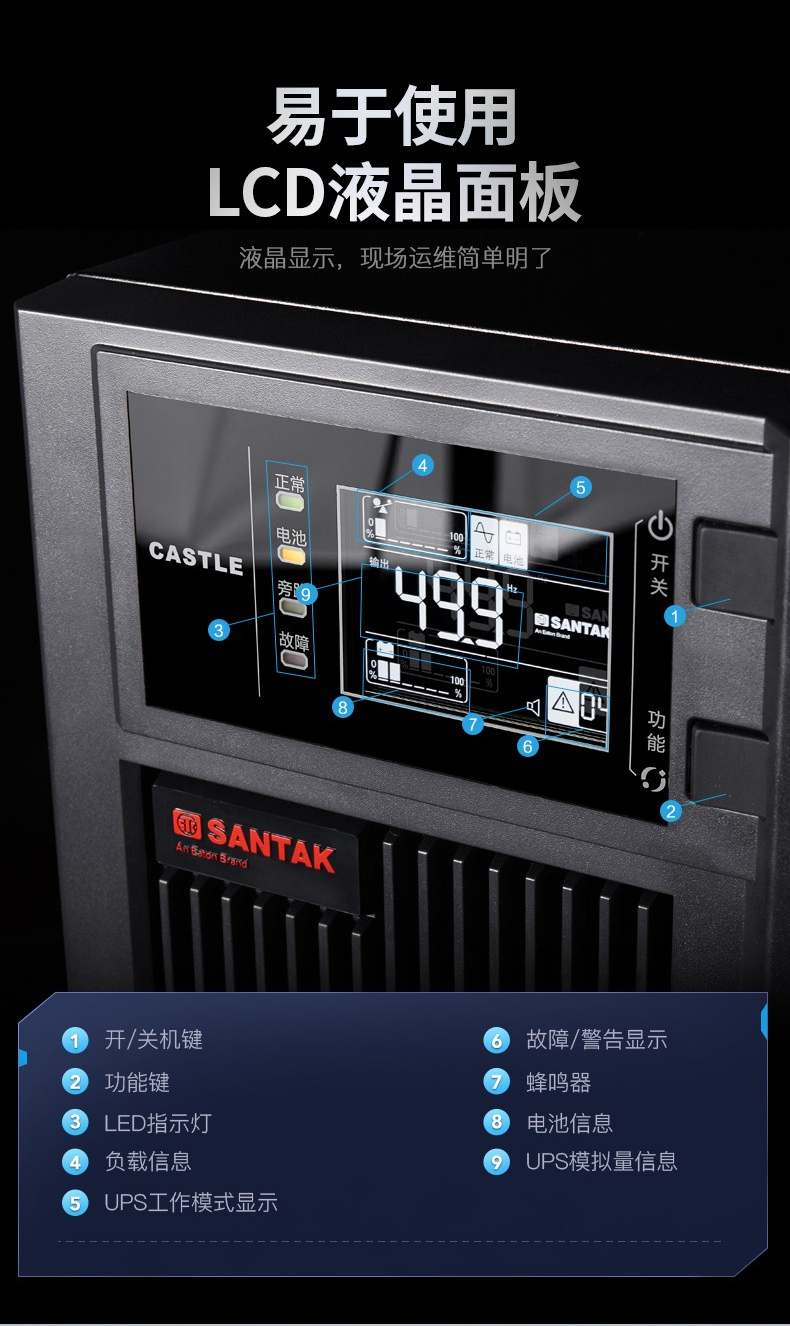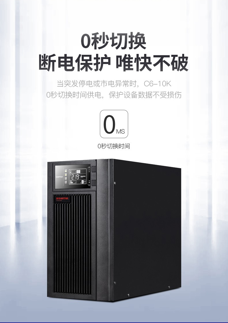 山特ups电源城堡系列是一款具有强壮习惯性、装备灵敏的商品。选用领先的dsp数字操控先进技能,有用的提高了商品功用和体系的牢靠性,并完成了更高功率密度的集成化和小型化。一起为了全方位的用户满意个性化需求,城堡系列供给了非常丰厚的可拓展功用,用户能够根据需求灵敏装备。
