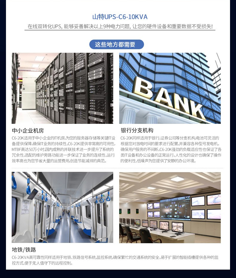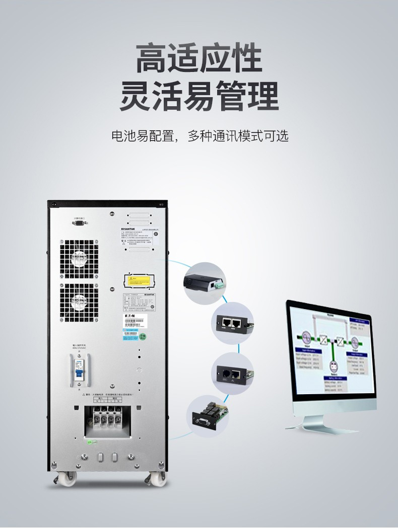 山特ups电源具有丰厚的拓展功用,全方位满意客户需求。在线修理功用:能够在负载持续供电情况下安全进行在线修理。长途停电功用(EPO):当紧急事端发作时,能够快速关断ups。并机组件:完成并联扩容和并联冗余功用,为用户供给电源计划的弹性和更安全的保证。防尘组件:提高商品在工业环境下的防尘等级。阻隔变压器:为用户供给阻隔维护。*详细装备请联系山特公司各分公司业务人员。