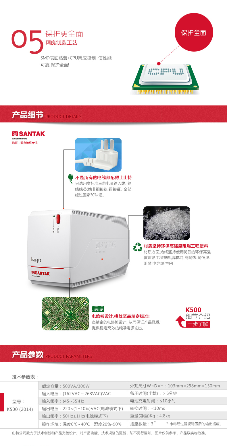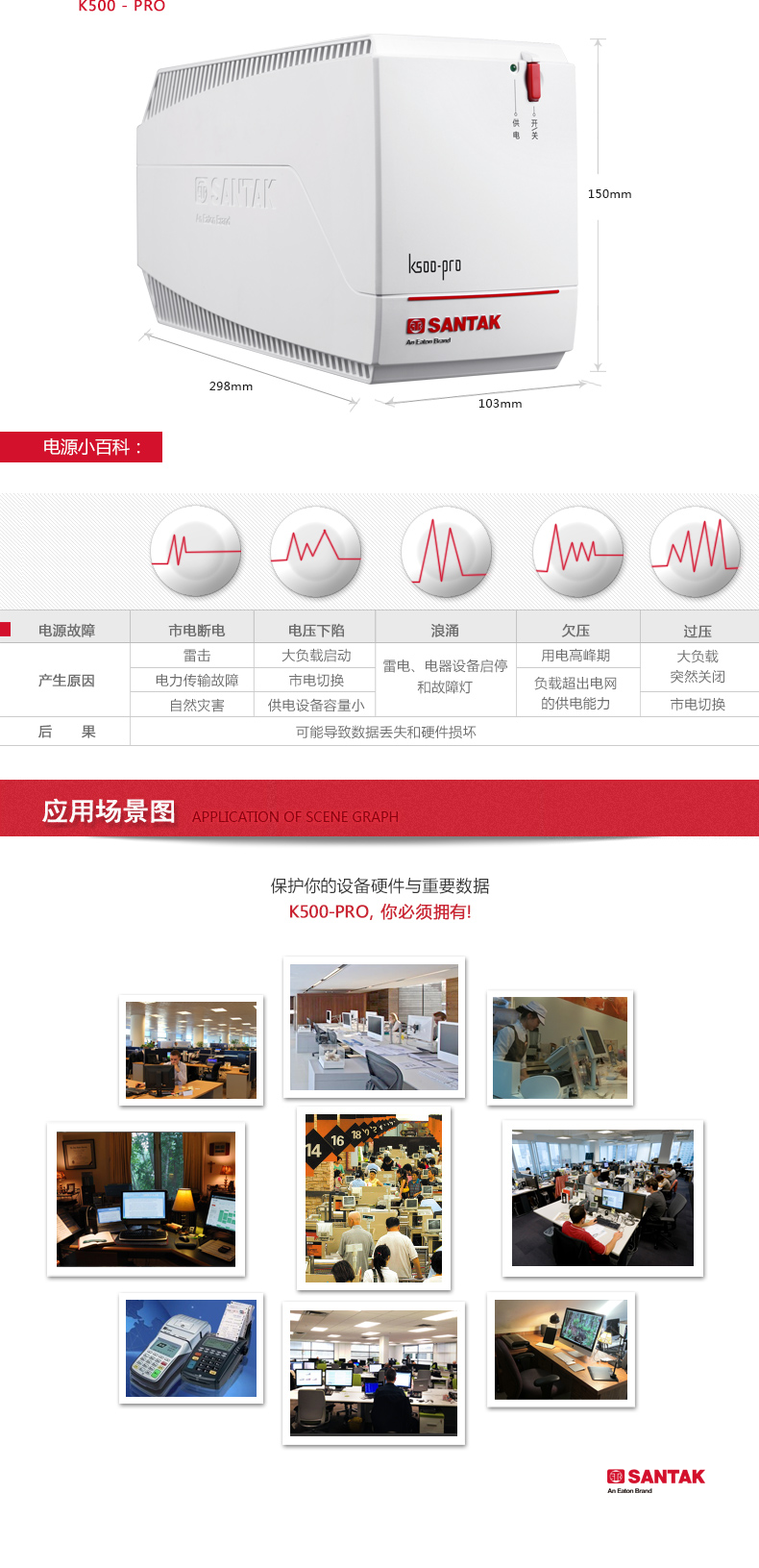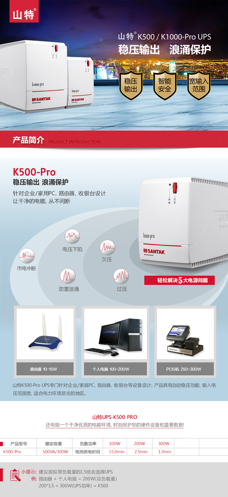 输出电压220V 用于:电脑/服务器 功能:稳压延时 类型:后备式 产品描述:K500/K1000 PRO产品特性: 主要应用场景描述 : 个人电脑,网络设备及娱乐设备 PC、家用路由器、 家用影音、娱乐系统等 办公及商务设备 办公电脑、POS机等设备