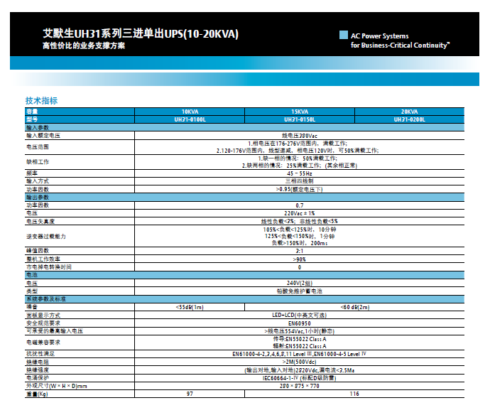 UH31系列UPS为三进单出型(三相输入,单相输出)智能高频在线式交流不间断电源系统,共有三个规格,额定输出容量分别为10kVA、15kVA和20kVA。适用于小型计算机中心、网络间、通信系统、办公终端、医疗设备和精密仪器设备的交流供电。